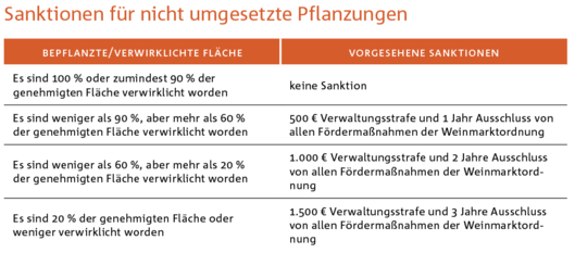 Sanktionen werden außerdem verhängt, wenn der Antragsteller ohne Genehmigung eine widerrechtliche Pflanzung vornimmt, wenn er eine größere Fläche bepflanzt, als ihm zugeteilt wird, oder wenn er nicht zugelassene Keltertraubensorten pflanzt. Die kleinstmöglichen Verwaltungsstrafen betragen hierfür 1.666,67 Euro je angebrochenem Hektar, wobei eine Rodung der widerrechtlich bepflanzten Rebflächen innerhalb von einem Monat ab der Mitteilung erfolgen muss. Erfolgt die Rodung nicht termingerecht, folgen weitere Verwaltungsstrafen, beginnend mit 6.000 Euro je angebrochenem Hektar. Zu beachten ist zudem, dass für jedes Jahr, in welchem eine nicht genehmigte Anpflanzung in Produktion steht, ohne dass deren Erzeugnisse destilliert wurden, eine Verwaltungsstrafe von wiederum 1.666,67 Euro ausgestellt wird. Dabei ist zu beachten, dass die kleinstmögliche Verwaltungsstrafe von 6.000 Euro auch für Flächen bis zu einem Hektar fix anzuwenden ist.