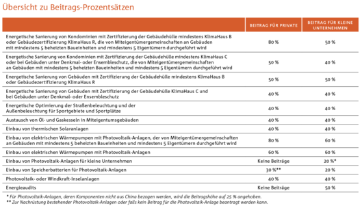 Weitere Förderungen gibt es für Photovoltaik- oder Windkraft-Inselanlagen (ohne Netzanschluss) mit 40 Prozent für Private oder kleine Unternehmen – wenn es für das Gebäude keine kostengünstigere Möglichkeit gibt, an das Stromnetz angeschlossen zu werden, z. B. für Almhütten. Auch Solarthermie zur Erzeugung von warmem Wasser wird weiter für Private und kleine Unternehmen außerhalb des Einzugsgebietes der Fernwärme mit 40 Prozent gefördert. In der Tabelle werden die Fördermöglichkeiten aufgelistet.