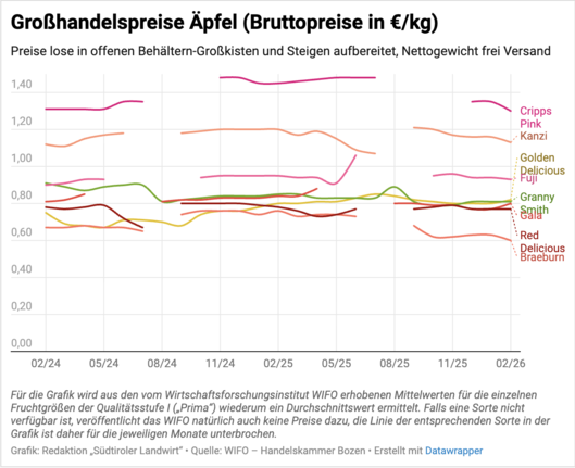 Das Wirtschaftsforschungsinstitut WIFO in Bozen veröffentlicht regelmäßig eine Auflistung von Großhandelspreisen für verschiedene Produkte. Mit der Veröffentlichung dieser Preise für die wichtigsten Südtiroler Apfelsorten wollen wir eine Orientierung für die Lage am Apfelmarkt bieten. Die Preise für Februar 2026 sind jetzt verfügbar.