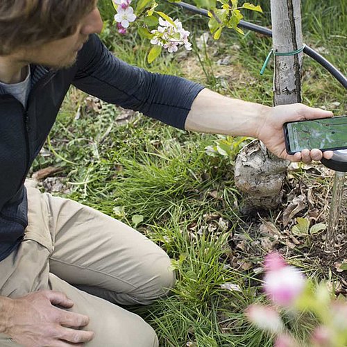 Auch wenn in Südtirol in der Regel ausreichend Niederschlag fällt, bleibt ein sparsamer Umgang mit Wasser wichtig, um Trockenperioden gut überbrücken zu können. „Wasser ist eine kostbare Ressource“, betont Gasser. „Unsere Bäuerinnen und Bauern setzen alles daran, sie effizient und umweltschonend einzusetzen“. Bereits heute sind Weinbauflächen und die meisten Obstanlagen mit Tropfbewässerung ausgestattet. Zunehmend kommen zusätzlich Sensoren zum Einsatz, die Bodentemperatur und Bodenfeuchte messen und so den genauen Wasserbedarf der Pflanzen ermitteln. Die Bewässerung kann anschließend gezielt per App gesteuert werden.