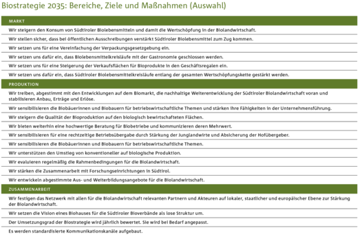 Herzstück der Biostrategie 2035 sind die drei Themenfelder Markt, Produktion und Zusammenarbeit. Dem Biokonzept 2025 hat die Entwicklung des Marktes einen Strich durch die Rechnung gemacht. Die erheblichen Verunsicherungen durch die hohe Inflation und damit durch den Kaufkraftverlust sowie den Ukraine-Konflikt machten sich auch auf den Märkten bemerkbar. Langsam erholen sich die Biomärkte wieder. Ziel der Biostrategie 2035 bleibt weiterhin, den Konsum von Südtiroler Biolebensmitteln und damit die Wertschöpfung in der Biolandwirtschaft dauerhaft zu steigern. Dafür nehmen die Partner unter anderem die Gastronomie ins Visier: Der Anteil von Südtiroler Biolebensmitteln in der heimischen Gastronomie soll sich in den nächsten zehn Jahren auf drei Prozent verdoppeln. Auch bei öffentlichen Ausschreibungen sollen verstärkt Südtiroler Biolebensmittel zum Zug kommen. Im Handel möchten die Partner die Verkaufsfläche für Bio und damit die Sichtbarkeit steigern. Insgesamt sollen so die Südtiroler Biolebensmittelkreisläufe entlang der gesamten Wertschöpfungskette gestärkt werden.