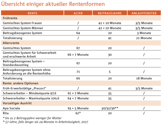 - Anpassung der Rentenvoraussetzungen an die Lebenserwartung: Ab 2027 wird die Lebenserwartung um einen Monat erhöht, ab 2028 um zwei Monate. Ausgenommen sind Personen mit Arbeit unter erschwerten Bedingungen, besonders belastende Tätigkeiten sowie die „Precoci“ (mit mindestens einem Beitragsjahr bis zum 19. Lebensjahr).