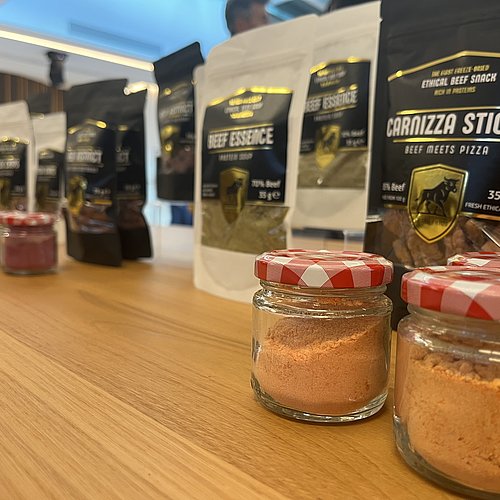 Bei der Entwicklung unserer Produkte haben wir vor allem mit Sportlerinnen und Sportlern zusammengearbeitet: Ihre Rückmeldungen waren durchwegs sehr gut – sowohl was den Geschmack anlangt als auch für die Snacks an sich. Die größte Zielgruppe verorten wir also da, das heißt bei Wanderern, Läuferinnen, Bergsteigern, aber auch bei Leuten, die hobbymäßig Tennis oder Fußball spielen … Auch für Menschen, die während ihrer Arbeit – beispielsweise im Büro – eine gesunde, hochwertige Mahlzeit zu sich nehmen möchten mit ausreichend Mineralien, vielen Proteinen und anderen wertvollen Inhaltsstoffen, sind die Snacks geeignet. Sie sind leicht, brauchen wenig Platz und sind praktisch mitzunehmen, lange haltbar sind sie obendrein. Der Fleischgeschmack bleibt im Hintergrund, vor allem schmecken unsere Produkte nach den Gewürzen bzw. Gemüsen, die wir dazugeben: also wahlweise nach Pizza, Minze oder Rote Bete.
