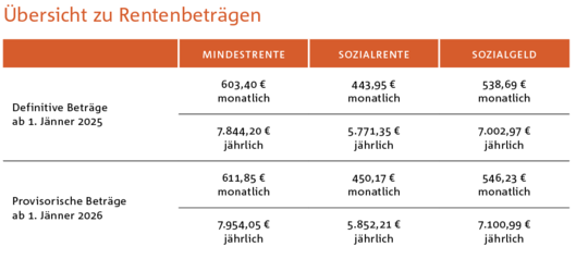 Für das Jahr 2025 war eine vorläufige Anpassung von 0,8 Prozent vorgesehen, d. h. die Beträge wurden je nach monatlicher Rentenhöhe um max. 0,8 Prozent erhöht. Diese vorläufige Anpassung wurde kürzlich vom zuständigen Ministerium für 2025 definitiv bestätigt. Für das Jahr 2026 ist eine vorläufige Anpassung von 1,4 Prozent vorgesehen, d. h. die Beträge werden je nach monatlicher Rentenhöhe um max. 1,4 Prozent erhöht. Diese vorläufige Anpassung wurde kürzlich vom zuständigen Ministerium erlassen. In der Tabelle sind die jeweiligen Beträge zusammengefasst.