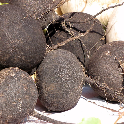 Schwarzer Rettich ist ein echtes Wintergemüse: Vor dem ersten Frost geerntet, kann die Rübe dank der dicken schwarzen Haut gut gelagert werden: Im kühlen Keller, in Sand eingeschlagen, hält sich der Schwarze Rettich problemlos bis ins Frühjahr. So zählt er – wie Karotten oder Rüben – zu den typischen Lagergemüsen. Es wird vermutet, dass Rettich bereits im alten Ägypten (vor etwa 2.500 Jahren) bekannt war und gegessen wurde. Von dort aus hat er sich im östlichen Mittelmeerraum verbreitet. Die Römer brachten den Rettich schließlich nach Mitteleuropa. Seit dem 13. Jahrhundert wird er verbreitet angebaut. Eine wichtige Rolle spielt der Schwarze Rettich auch in der asiatischen Küche, seine Schärfe macht ihn beispielsweise zu einer beliebten Beilage zu japanischen und koreanischen Gerichten. Der Winterrettich liebt humose, tiefgründige Böden, kommt aber auch mit lehmigen Standorten erstaunlich gut zurecht. Er wird von Juli bis August direkt ins Freiland gesät. Die Samen werden nur leicht mit Erde bedeckt, gut angedrückt und feucht gehalten. Während der Wachstumszeit sollte regelmäßig und gleichmäßig gegossen werden. Da Rettiche zu den Kreuzblütlern (Brassicaceae) gehören, sind sie keine guten Nachbarn oder Vorfrüchte für Kohlgewächse, die auch zu den Kreuzblütlern gehören.