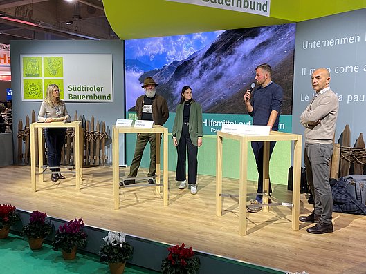 Podiumsdiskussion mit (v. l.) Thomas Prünster, Roberto Dinale, Markus Plattner, Valentin Baumgartner, Walter Gostner und Moderatorin Marianne Kuntz.