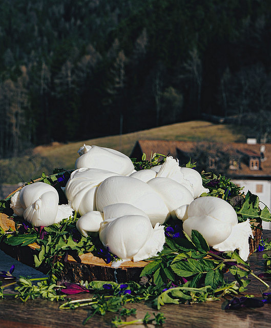 Mozzarella aus Kuhmilch herzustellen, ist schwierig: „Auf einer Skala von eins bis zehn steht sie auf einer sechs“, erklärt Omar. „Wenn sie aber aus Büffelmilch gemacht wird, ist es eine gute 8,5!“ Denn Büffelmilch enthält doppelt so viel Fett wie Kuhmilch und um 50 Prozent mehr Protein. Dadurch ist die Ausbeute höher, aus 100 Liter Büffelmilch werden 25 Kilogramm Mozzarella gewonnen, aus Kuhmilch nur etwa 15 Kilogramm. Der höhere Fettgehalt bringt zwar mehr Geschmack, macht aber auch den Produktionsprozess schwieriger: Temperatur, ph-Wert und Zeiten müssen genau im Auge behalten und die Verarbeitungsschritte präzise darauf abgestimmt werden. Natürlich konnten sich die drei Partner von Amò nicht mit der vergleichsweise einfachen Herstellung von Kuhmilch-Mozzarella zufriedengeben, sie wollten sich in der Königsdisziplin üben und echte Südtiroler Büffelmozzarella herstellen: Also gingen sie auf die Suche nach Bäuerinnen und Bauern, die Büffel anschaffen und für die Käserei Büffelmilch liefern wollten. Zunächst allerdings ohne Erfolg. Wie es der Zufall aber haben wollte, erfuhr Omar Signori vom Untermiglerhof und von den jungen Bauersleuten, die dort bereits Büffel hielten. Also nahm er Kontakt mit ihnen auf, bald wurde man sich einig: Seit 2022 liefern Elisabeth und Simon ihre Milch an die Käserei Amò, wo sie zu Südtiroler Büffelmozzarella nach traditionellem Rezept verarbeitet wird. „Unsere Produkte werden zur Gänze aus roher Bioheumilch hergestellt, und zwar nach dem klassischen Verfahren, also mit Laktobazillen: Dadurch sind sie natürlich laktosefrei, geschmacklich und auch von der Konsistenz her ist die Mozzarella anders als die, die man hier in Südtirol sonst herstellt“, erklärt Omar Signori. Gesundheitliche Bedenken wegen der Rohmilch kann er zerstreuen: „Wird sauber gearbeitet, ist Rohmilch kein Problem. Zudem wird das Käseteigziehen, die sogenannte ,filatura‘, in 90 bis 95 Grad Celsius heißem Wasser gemacht, was eine Art Pasteurisation darstellt“, stellt er klar.